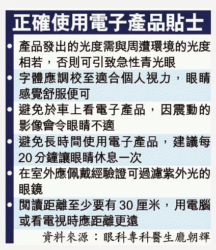 眼科專科醫生龐朝輝提醒,紫外光無處不在,在室外尤其需要佩戴經驗證能過濾紫外光的太陽眼鏡;在昏暗環境使用發光電子產品,也會增加罹患急性青光眼風險,女士們更是高風險一族。